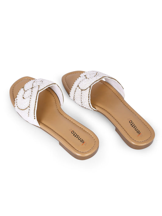 Kenstto Beaded Flats for Women & Girls | Daily Wear - White
